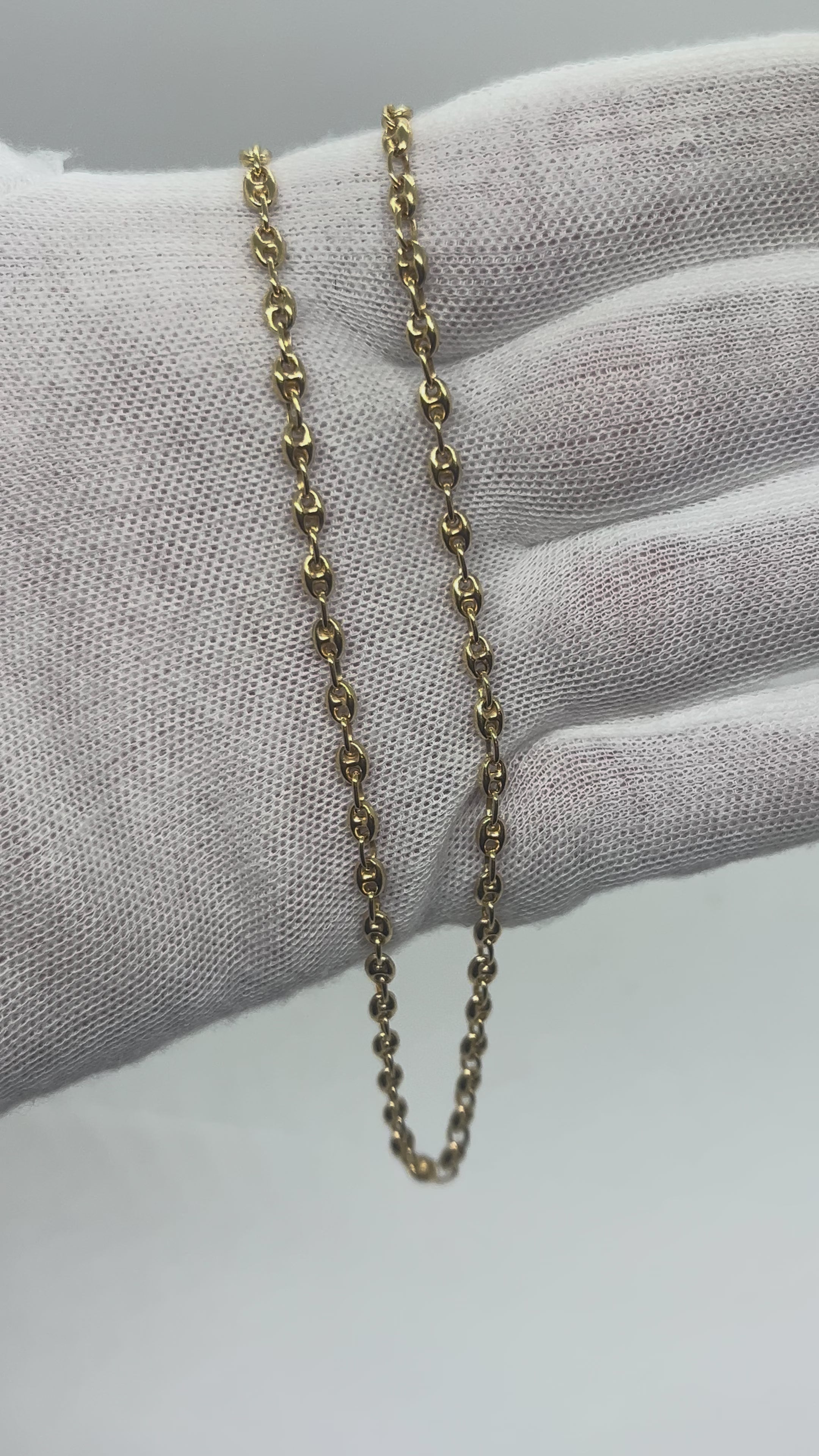 This 10k gold Gucci/Mariner chain features a 3.4mm width and a semi-solid construction, offering a refined balance between durability and lightweight comfort. Its classic mariner link design provides timeless elegance, making it an ideal accessory for both everyday wear and special occasions. Crafted with expert precision, this chain ensures lasting quality and a sophisticated finish.