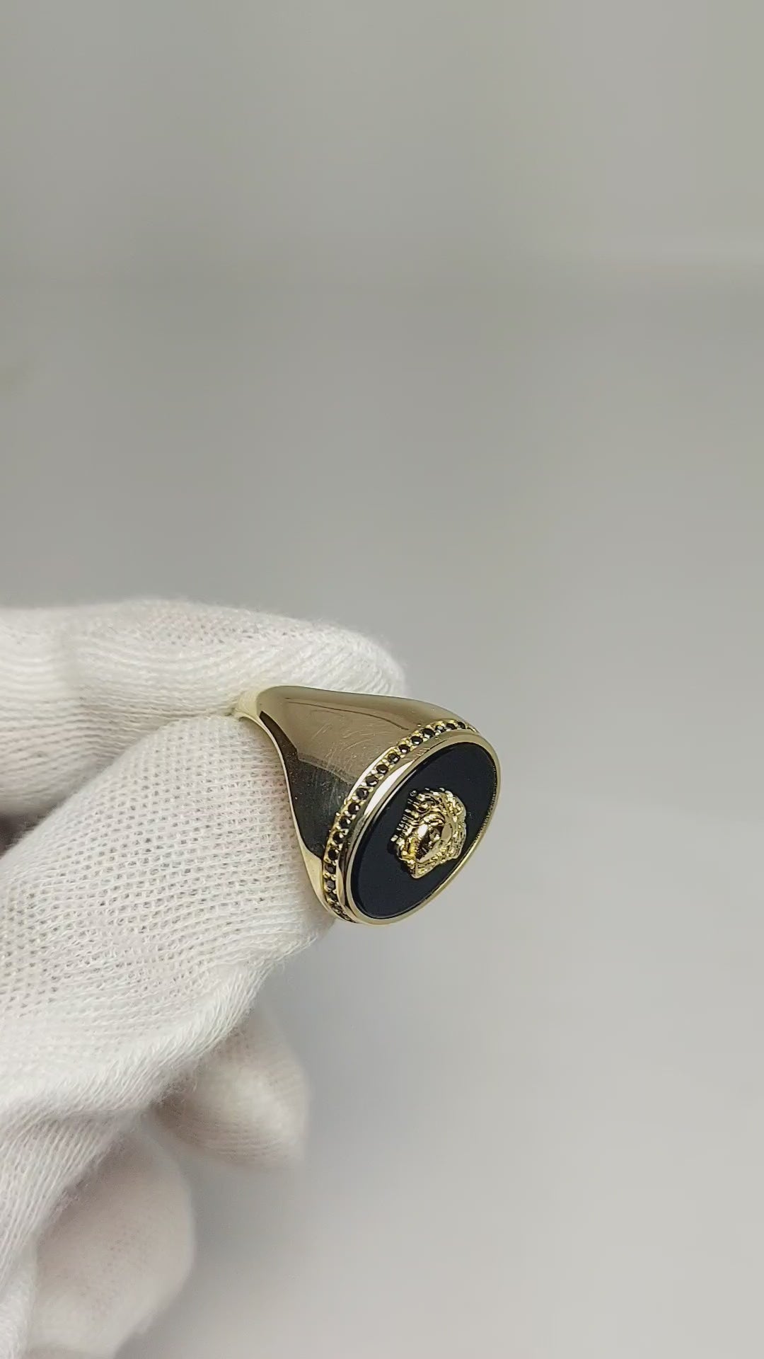 Be unique and stand out with this statement piece. Crafted with10k gold, this exquisite ring features the mythological Medusa atop the bold black onyx stone. Be powerful and regal with this exquisite piece of jewelry.