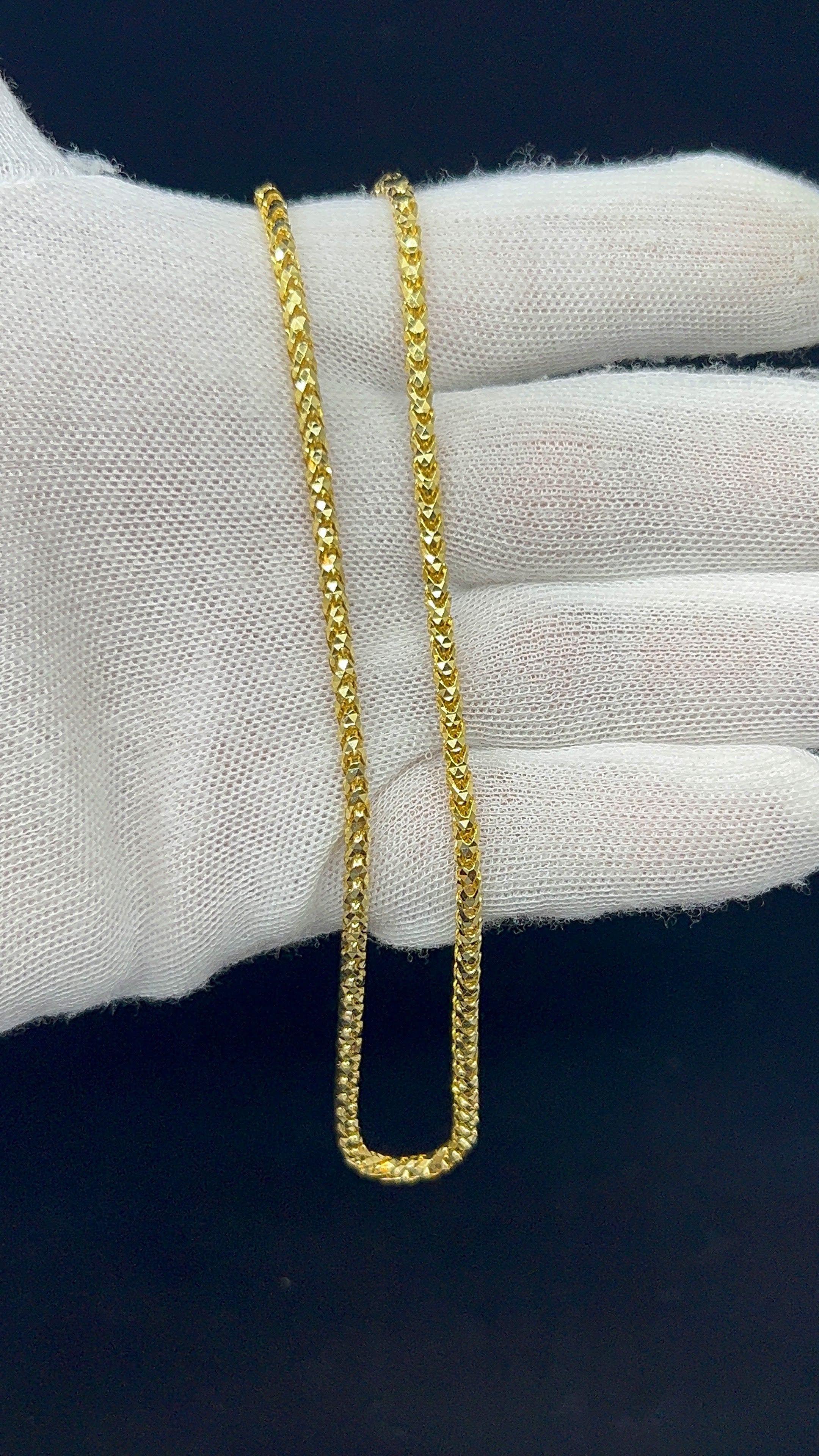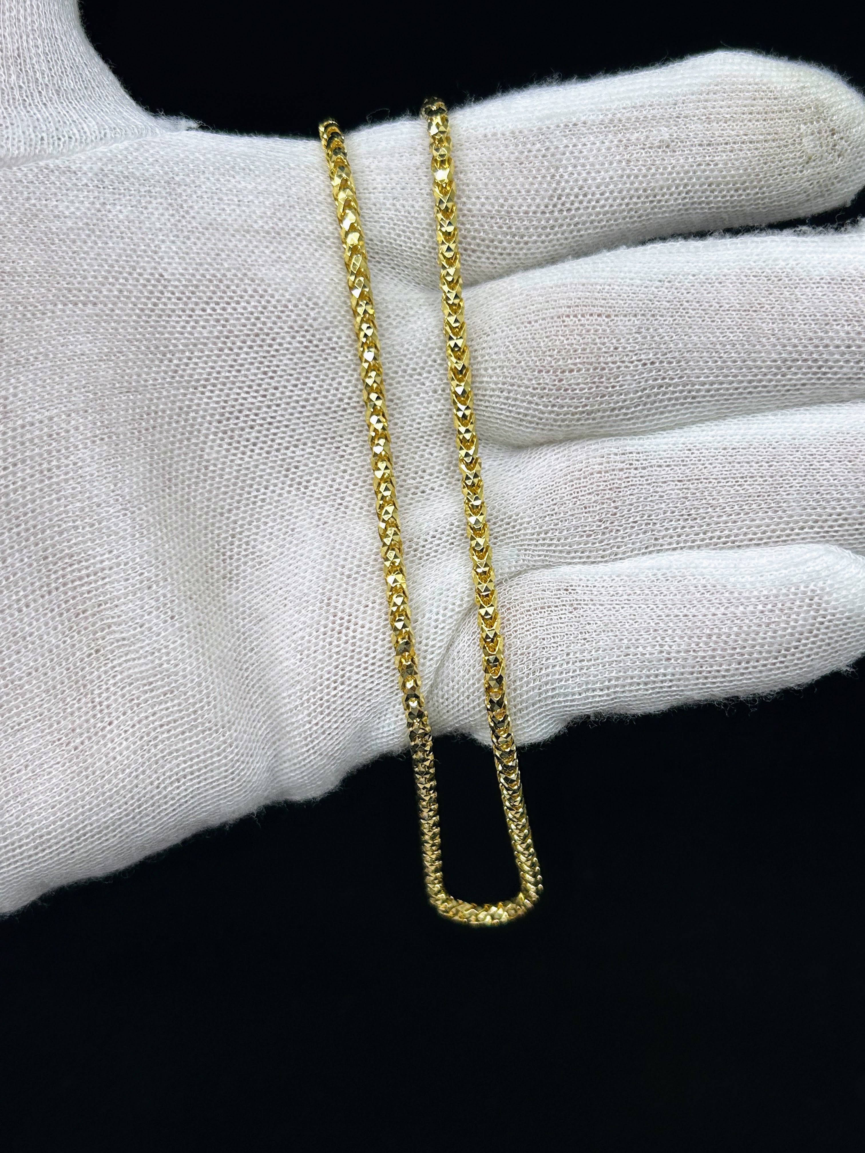 This 10k gold round solid Franco chain features a precise 3.1mm diamond cut, enhancing its brilliance and durability. Crafted from solid gold, it offers lasting strength and a refined finish. Ideal for everyday wear or layering, this chain combines expert craftsmanship with exceptional value, making it one of the best-priced options available in Montreal.