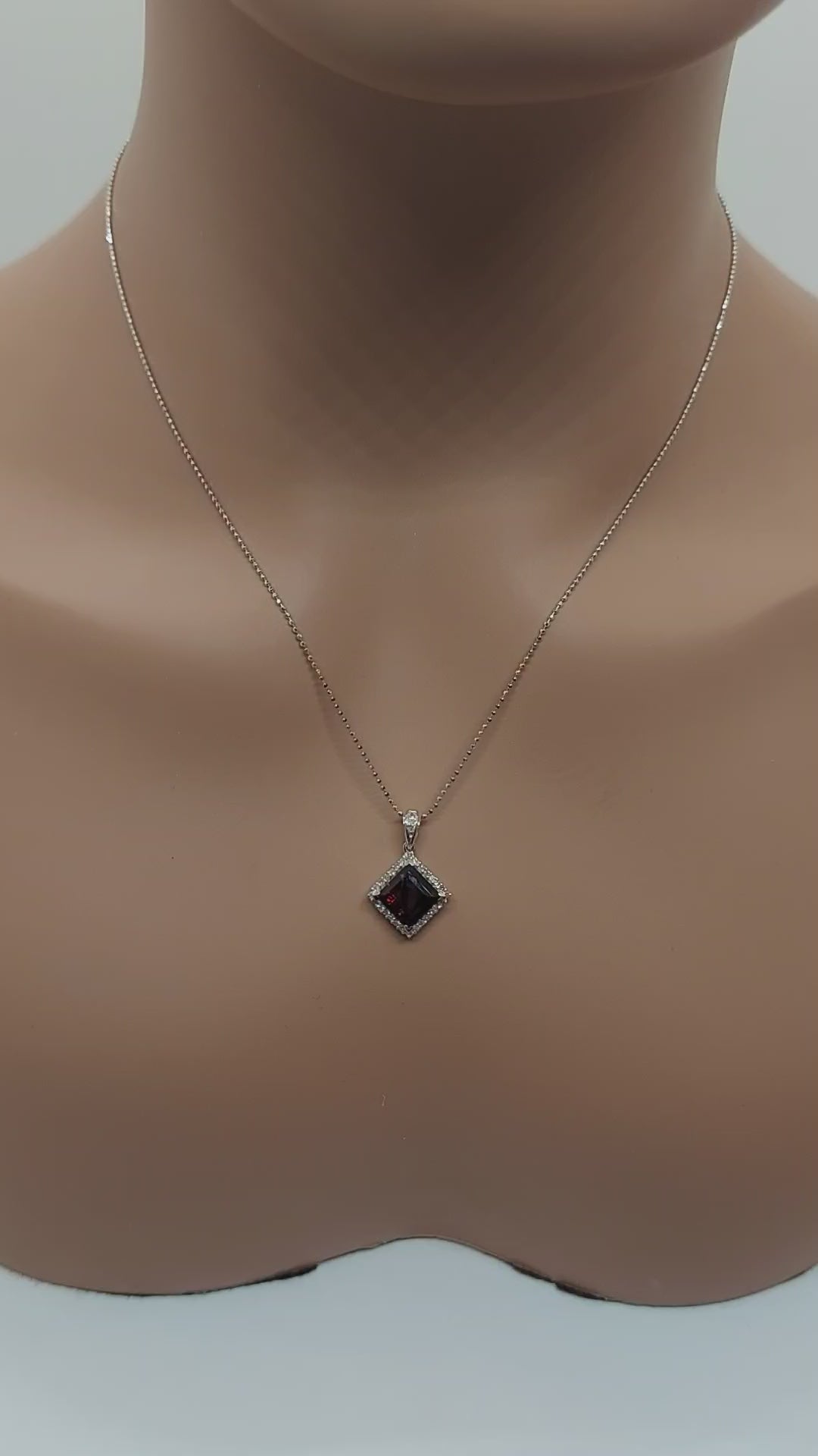 14k Real Solid White Gold Necklace with lozenge shaped Garnet and Real Natural diamonds for Women